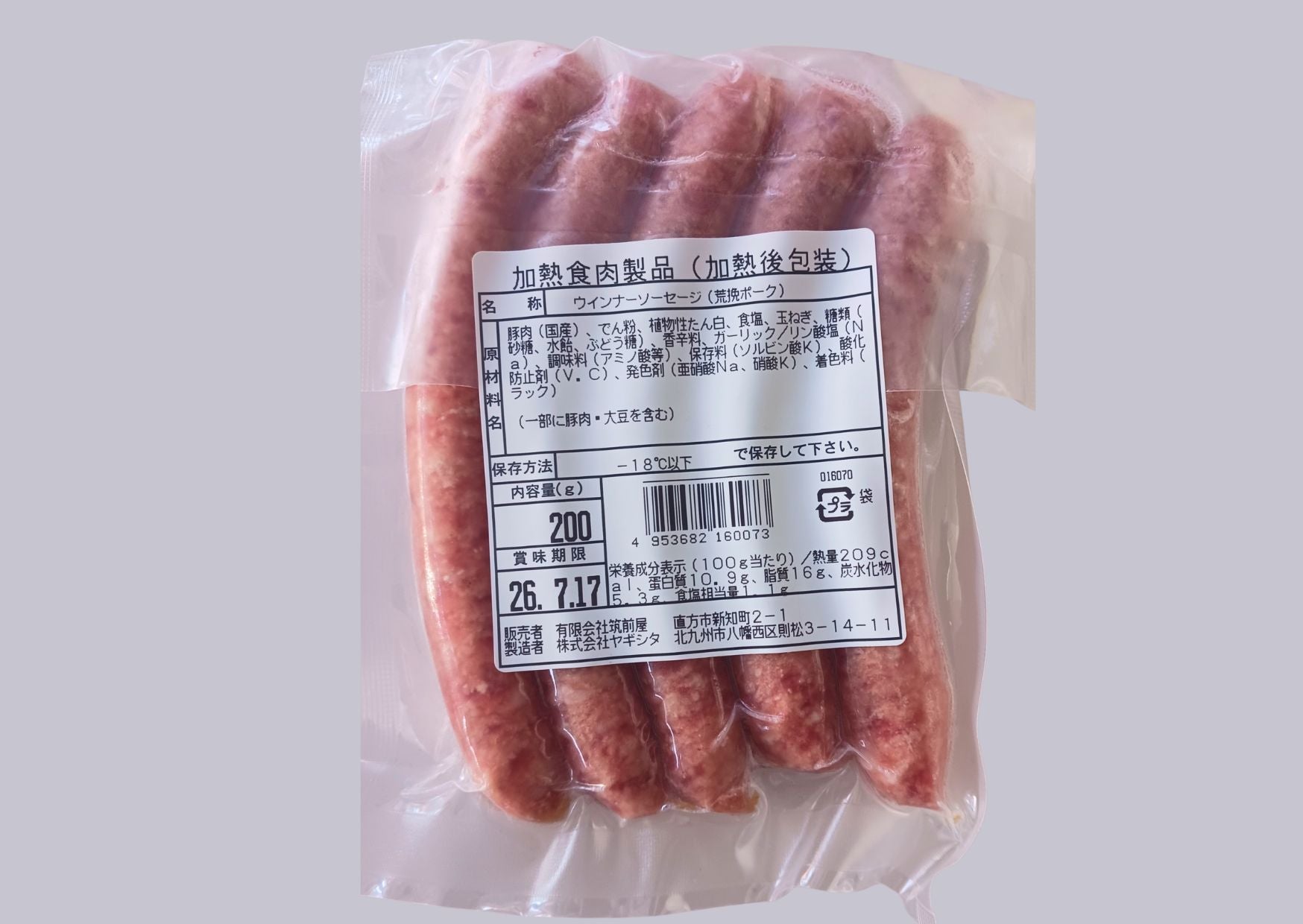 原材料名 豚肉(国産)、でん粉、植物性たん白、食塩、玉ねぎ、糖類(砂糖、水飴、ぶどう糖)、香辛料、ガーリック/リン酸塩(Na)、調味料(アミノ酸等)、保存料(ソルビン酸K)、酸化防止剤(V.C)、発色剤(亜硝酸Na、硝酸K)、着色料(ラック)、(一部に豚肉・大豆を含む)